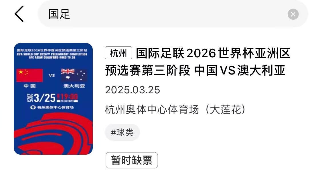 有钱也买不到了!黄牛平台显示,国足vs澳大利亚已缺票