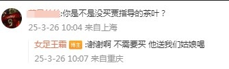 有网友在评论里留言提问“你是不是没买贾指导的茶叶?”对此王霜回复写道:“谢谢啊,不需要买,他送我们姑娘喝。”