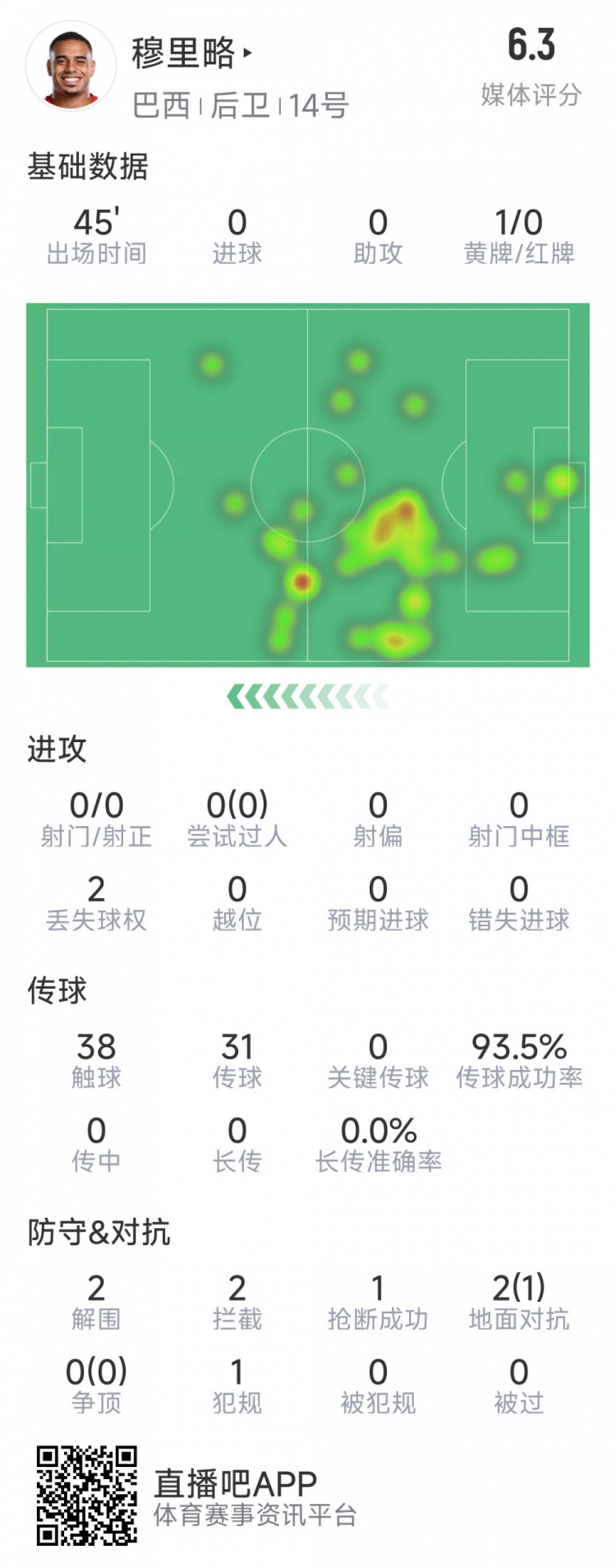 半场被换下,穆里略本场数据:两次乌龙助攻,2解围&2拦截