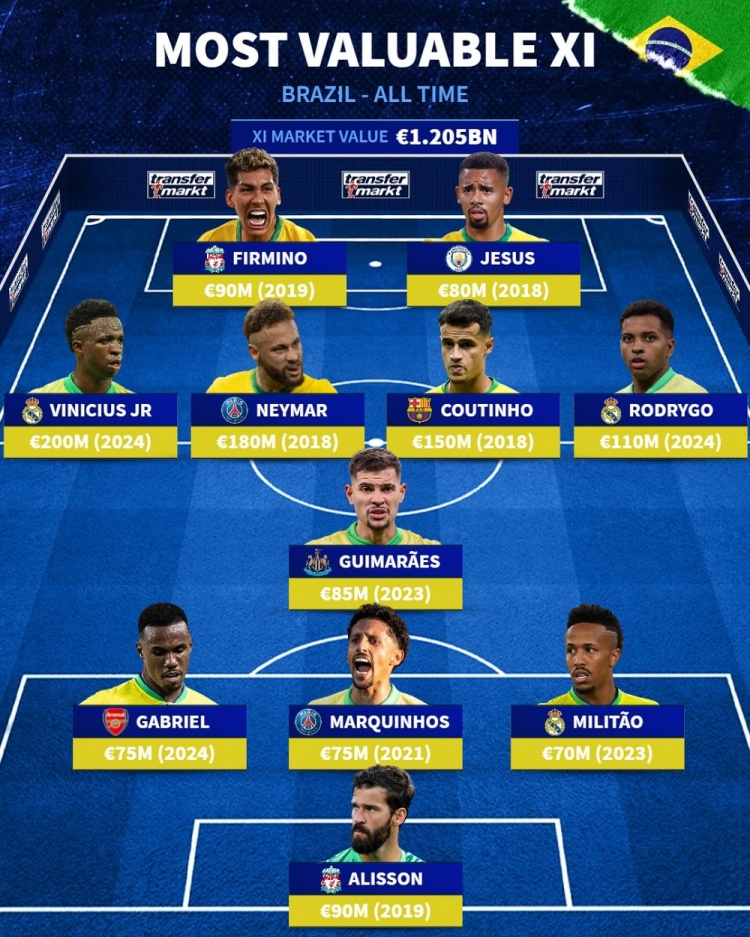 巴西历史德转身价最高阵:内马尔、维尼修斯在列,总价12亿欧