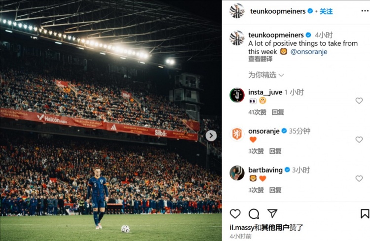 库普梅纳斯在社交媒体上写道:“这一周发生了许多积极的事情。”乍一看似乎是对莫塔的暗讽,但库普梅纳斯标注了荷兰队,并且配图也是荷兰国家队的赛场照,因此可以认为他是在谈论荷兰的欧国联之旅。