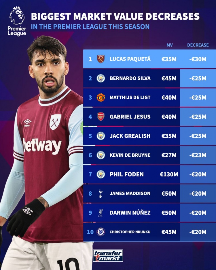 本赛季英超身价下跌榜:帕奎塔3000万欧,B席、德里赫特2500万欧