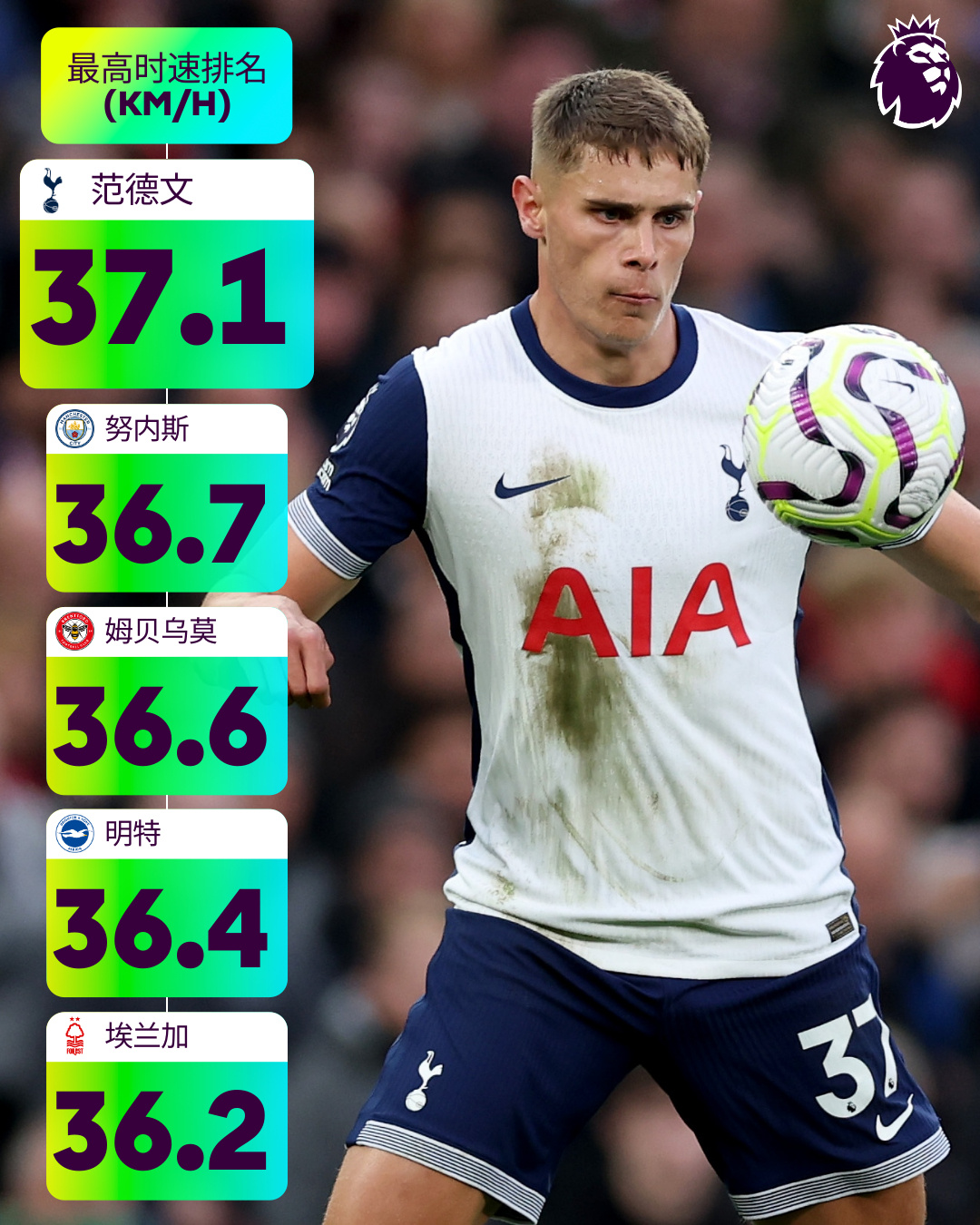本赛季英超至今球员最高时速:范德文领跑,努内斯、姆贝莫二三