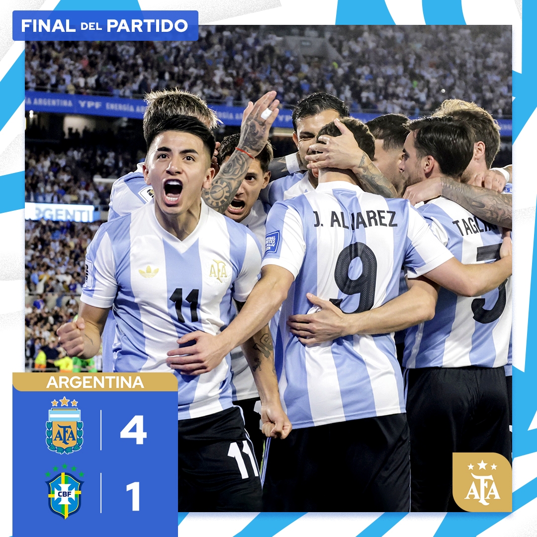 03月26日讯 南美世预赛第14轮,阿根廷4-1击败巴西。为阿根廷破门的4人分别是阿尔瓦雷斯、恩佐、麦卡利斯特和朱利亚诺-西蒙尼。