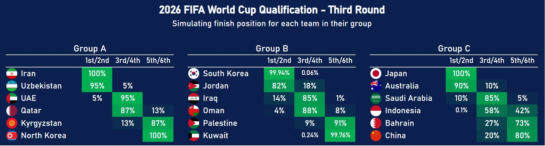 其中中国队20%排3/4(附加赛),80%排在5/6(无缘世界杯),而印尼58%概率获得附加赛资格。