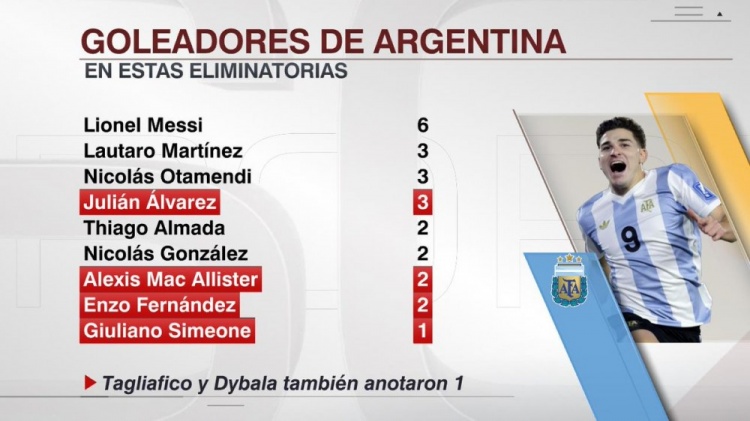 ESPN统计了阿根廷球员本届世预赛的进球数量,并列出榜单,梅西以6球居首,劳塔罗、奥塔门迪、阿尔瓦雷斯3球次席。