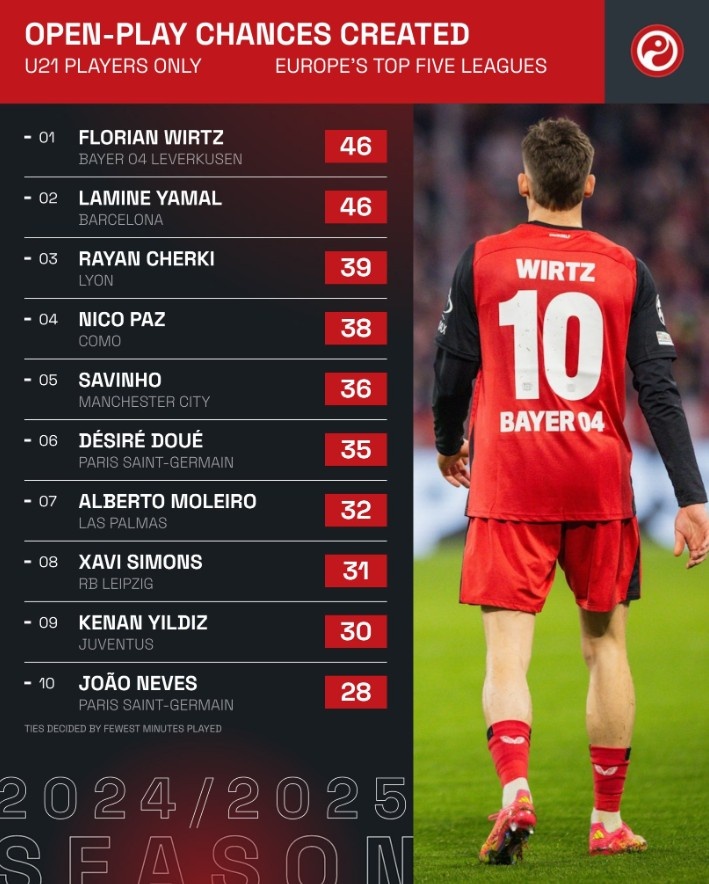 五大联赛U21运动战创造机会排行:亚马尔、维尔茨46次并列榜首