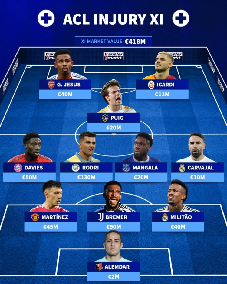 - 德转排本赛季十字韧带受伤阵:罗德里、戴维斯、二弟、米利唐在列