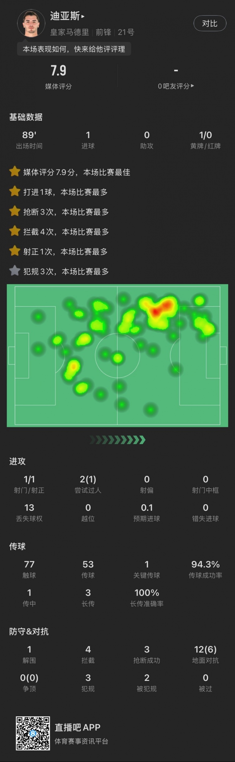 - 迪亚斯本场:1次射门进1球,贡献4拦截3抢断,评分7.9全场最高
