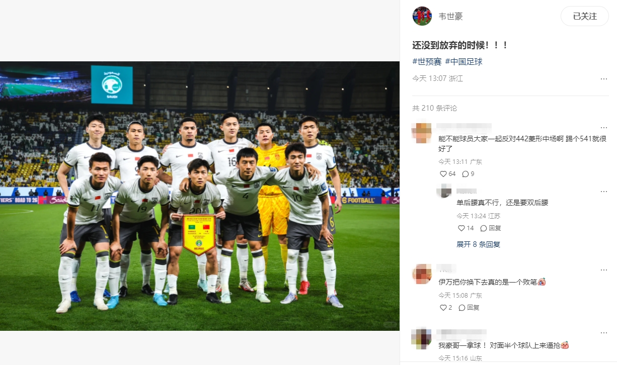 国足遭遇三连败,韦世豪:还没到放弃的时候!!!