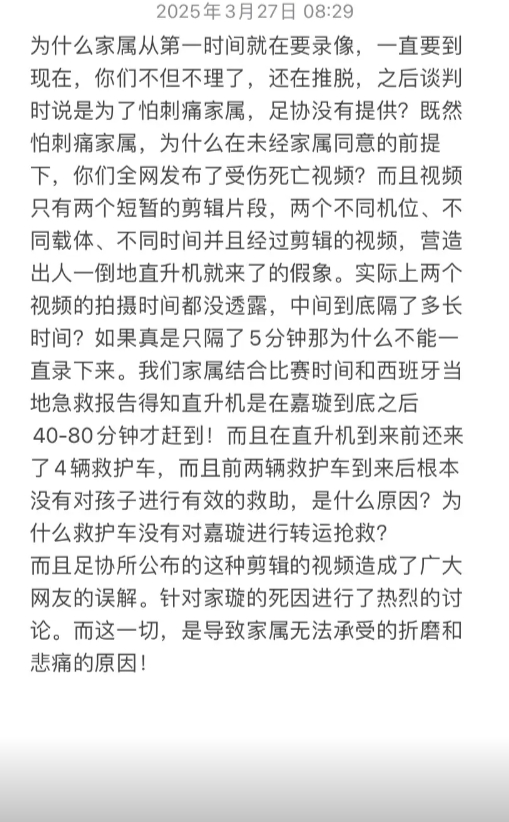 为什么家属从第一时间就在要录像,一直要到现在,你们不但不理了,还在推脱,之后谈判时说是为了怕刺痛家属,足协没有提供?既然怕刺痛家属,为什么在未经家属同意的前提下,你们全网发布了受伤死亡视频?而且视频只有两个短暂的剪辑片段,两个不同机位、不同载体、不同时间并且经过剪辑的视频,营造出人一倒地直升机就来了的假象。实际上两个视频的拍摄时间都没透露,中间到底隔了多长时间?如果真是只隔了5分钟那为什么不能一直录下来。
