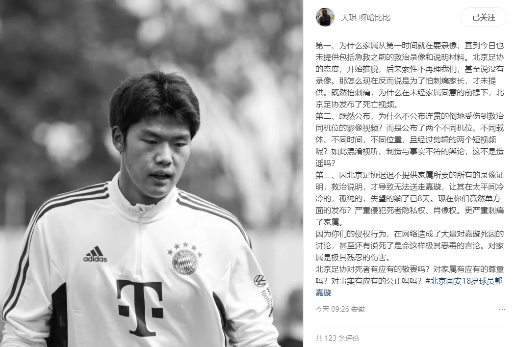 郭嘉璇家属质问北京足协:为何视频不连贯?直升机40-80分钟才到