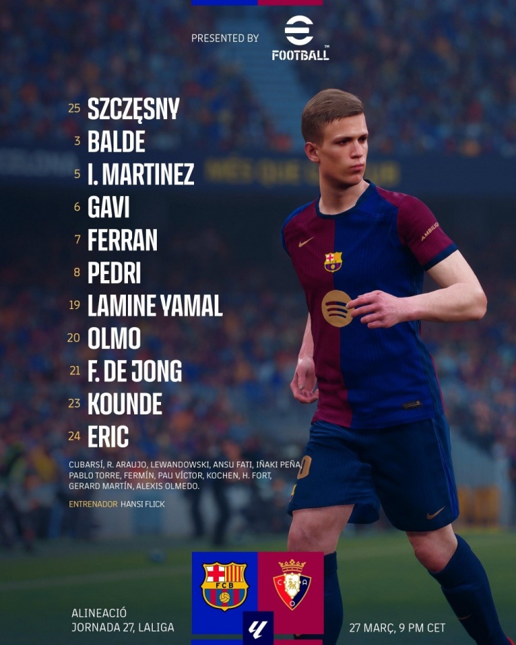 巴萨首发:25-什琴斯尼、23-孔德、24-加西亚、5-伊尼戈、3-巴尔德、8-佩德里、21-德容、6-加维、19-亚马尔、7-费兰、20-奥尔莫