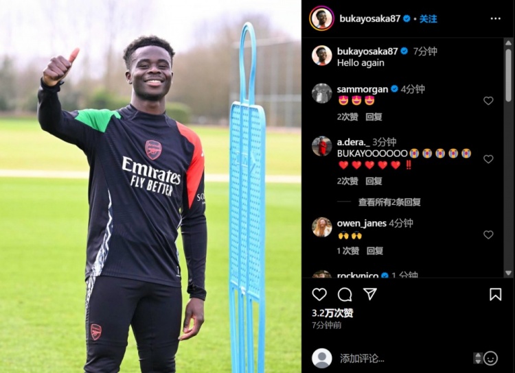 - 接近复出,萨卡社媒晒身穿训练服照片:又见面了