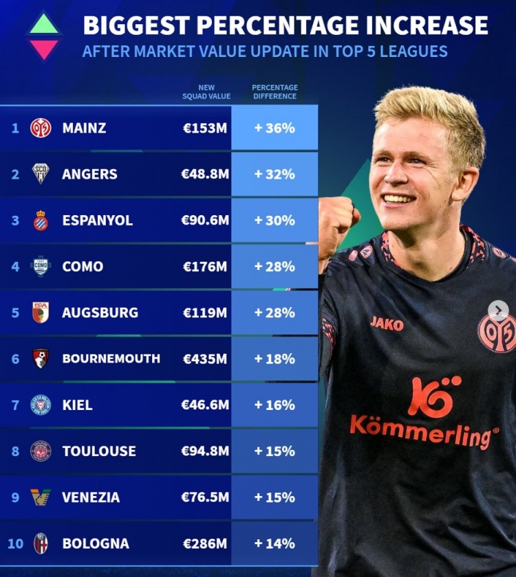 五大联赛球队身价升值比例:美因茨涨36%,博洛尼亚&伯恩茅斯在列