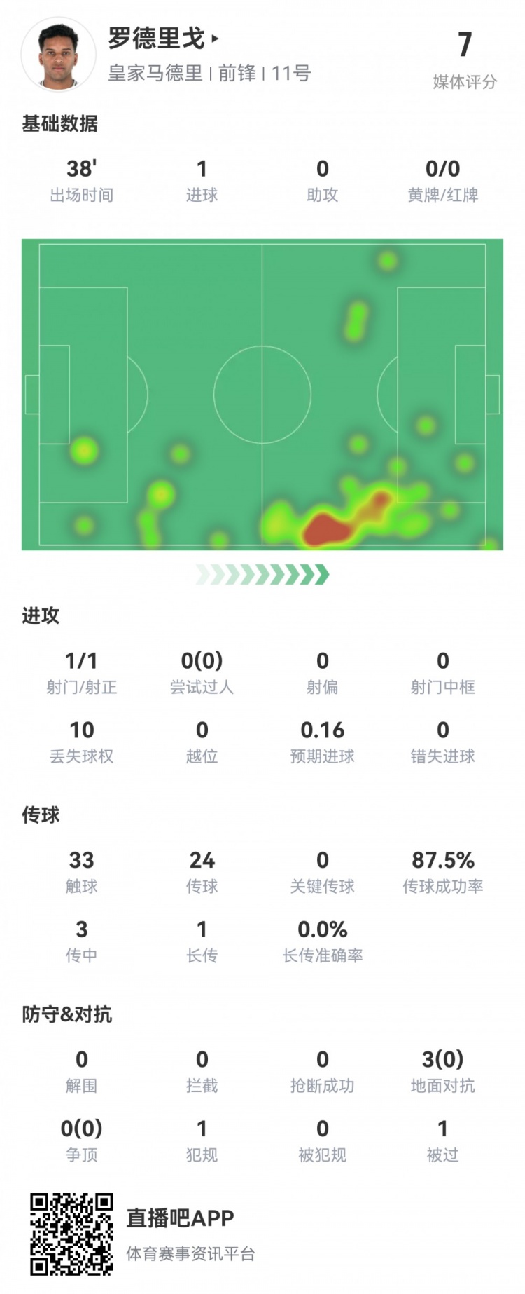 - 闪击建功!罗德里戈半场数据:1射1正1粒进球,评分7.0