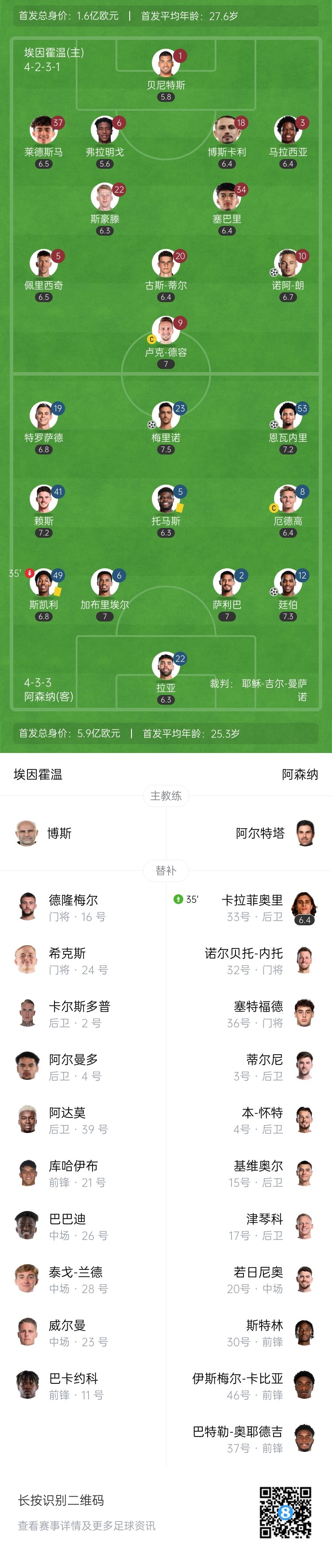 - 半场-阿森纳3-1埃因霍温 梅里诺建功 托马斯送点斯凯利染黄被换下