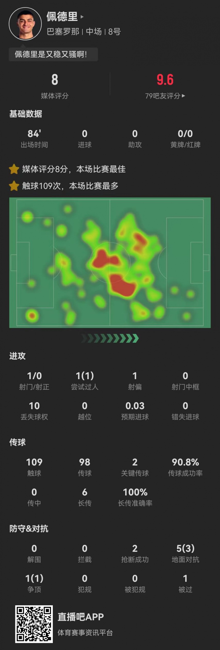 当选西甲官方全场最佳!佩德里本场2关键传球+6长传6成功+2抢断