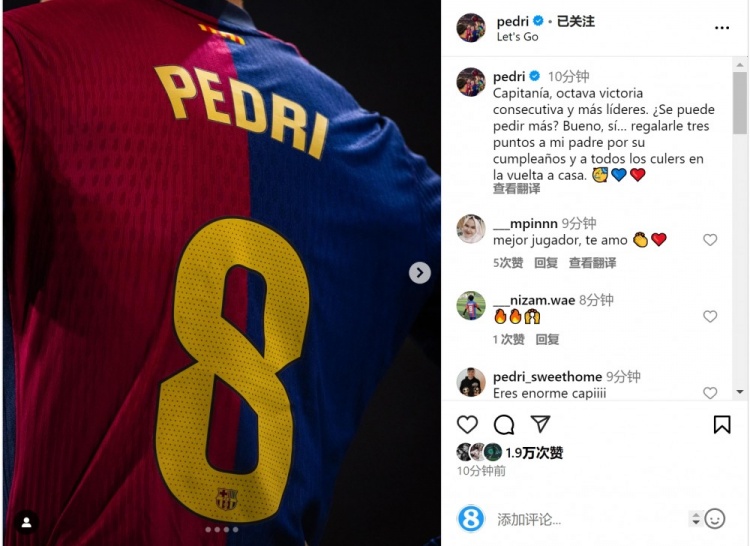 全场最佳!佩德里社媒:担任队长+西甲8连胜,三分献给巴萨球迷