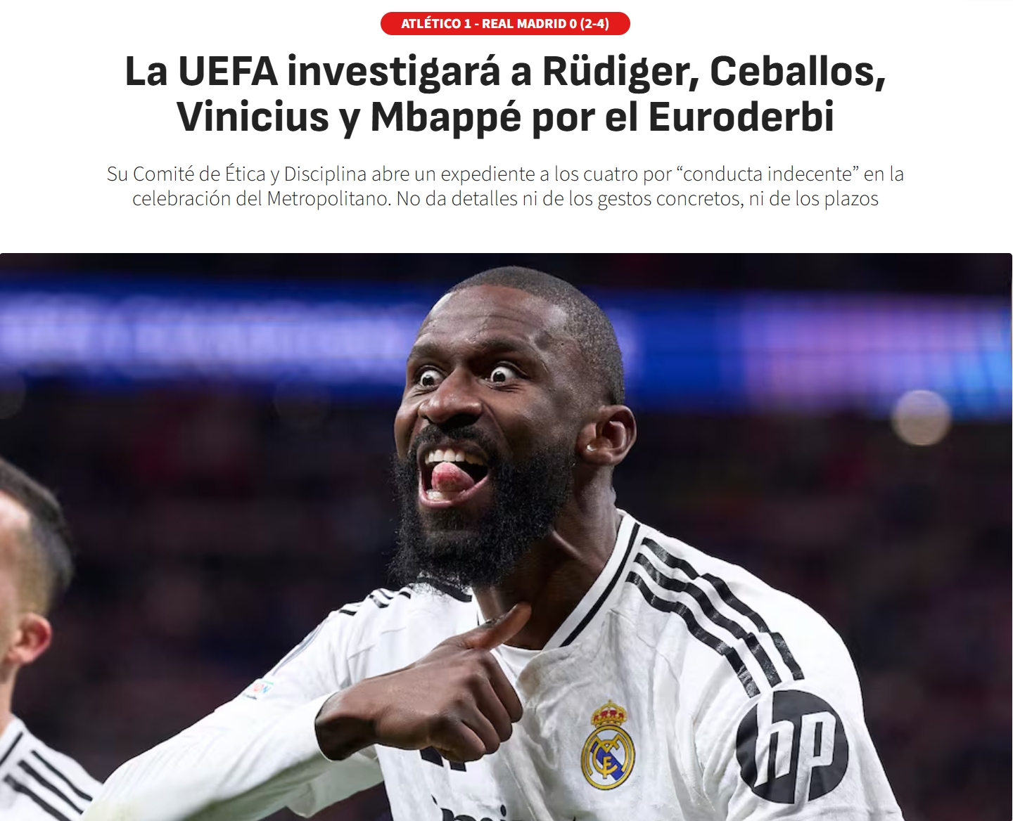03月28日讯 欧足联官方昨日发布官方公告,宣布对姆巴佩、维尼修斯、吕迪格、塞巴略斯4名皇马球员在欧冠对马竞赛后的不当行为展开进一步调查。《阿斯报》透露了皇马俱乐部方面对此的立场。