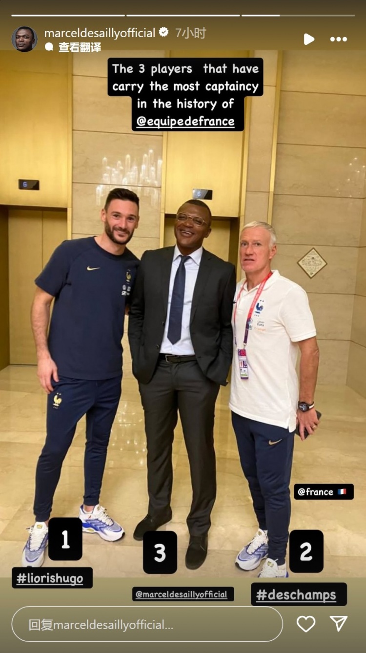德塞利社媒晒出与德尚、洛里的合照,并配文:“法国队史担任队长次数最多的三名球员。”
