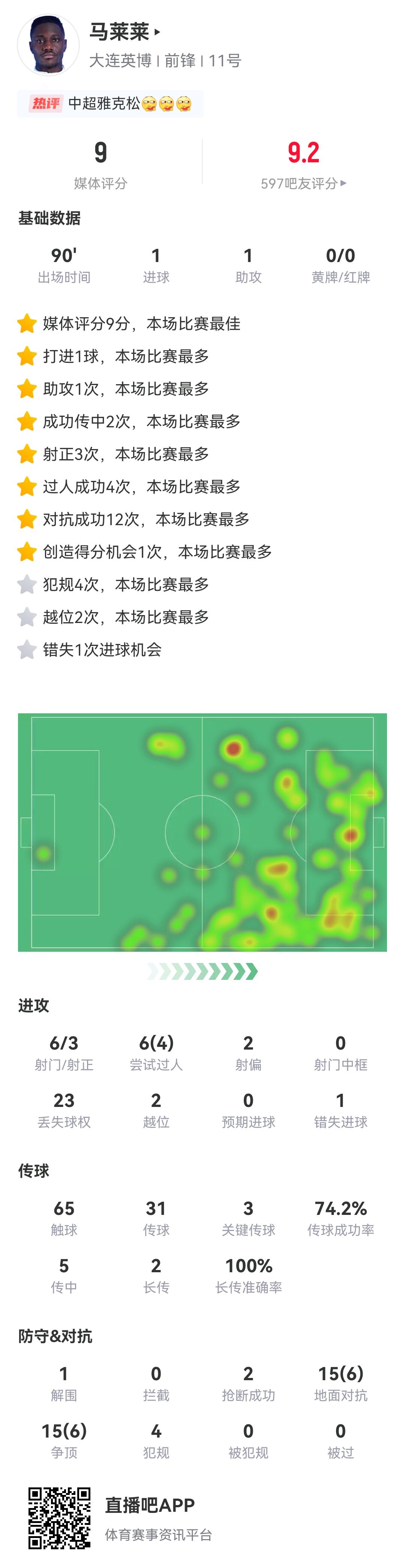 本场比赛马莱莱在前场表现出色,多项数据本场比赛最佳。但同时,马莱莱也有打丢单刀,甚至是失空门的表现。
