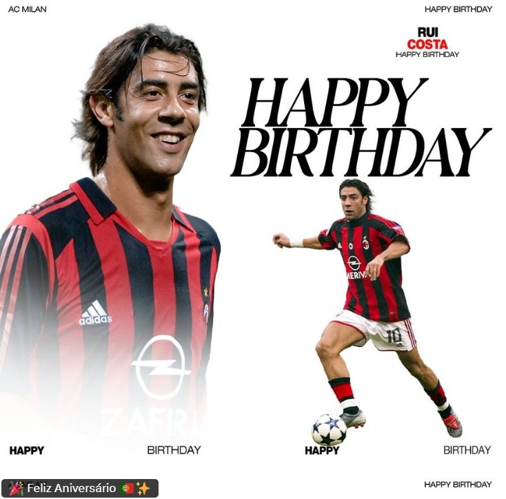 - AC米兰官方祝鲁伊-科斯塔53岁生日快乐,曾随队夺欧冠等5项冠军