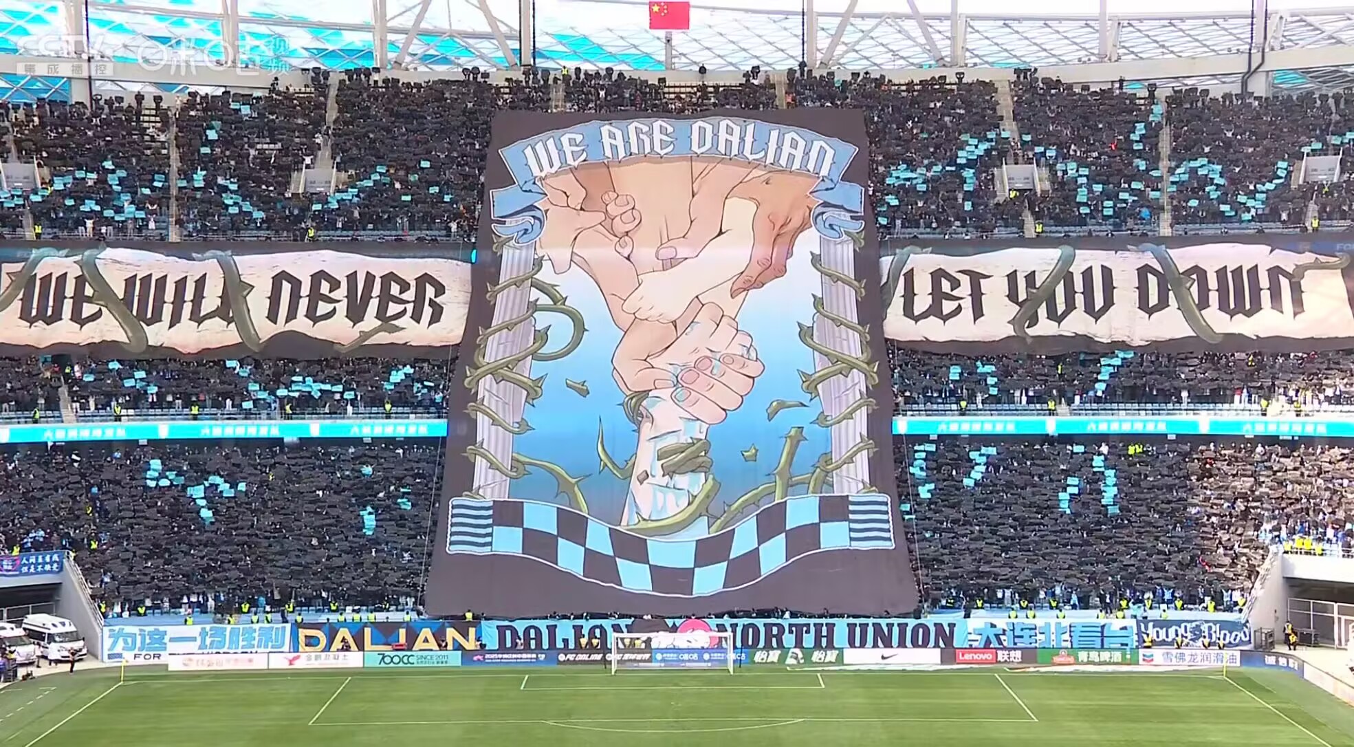 霸气!东北德比前大连英博升起巨幅tifo——我们是大连