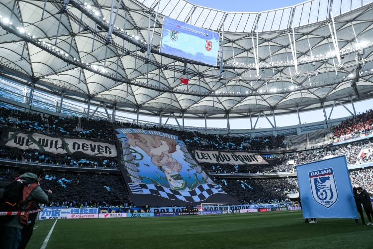 03月29日讯 中超第3轮,大连英博vs长春亚泰,大连梭鱼湾迎来2025赛季主场首秀,赛前球迷升起了巨幅TIFO——我们是大连!