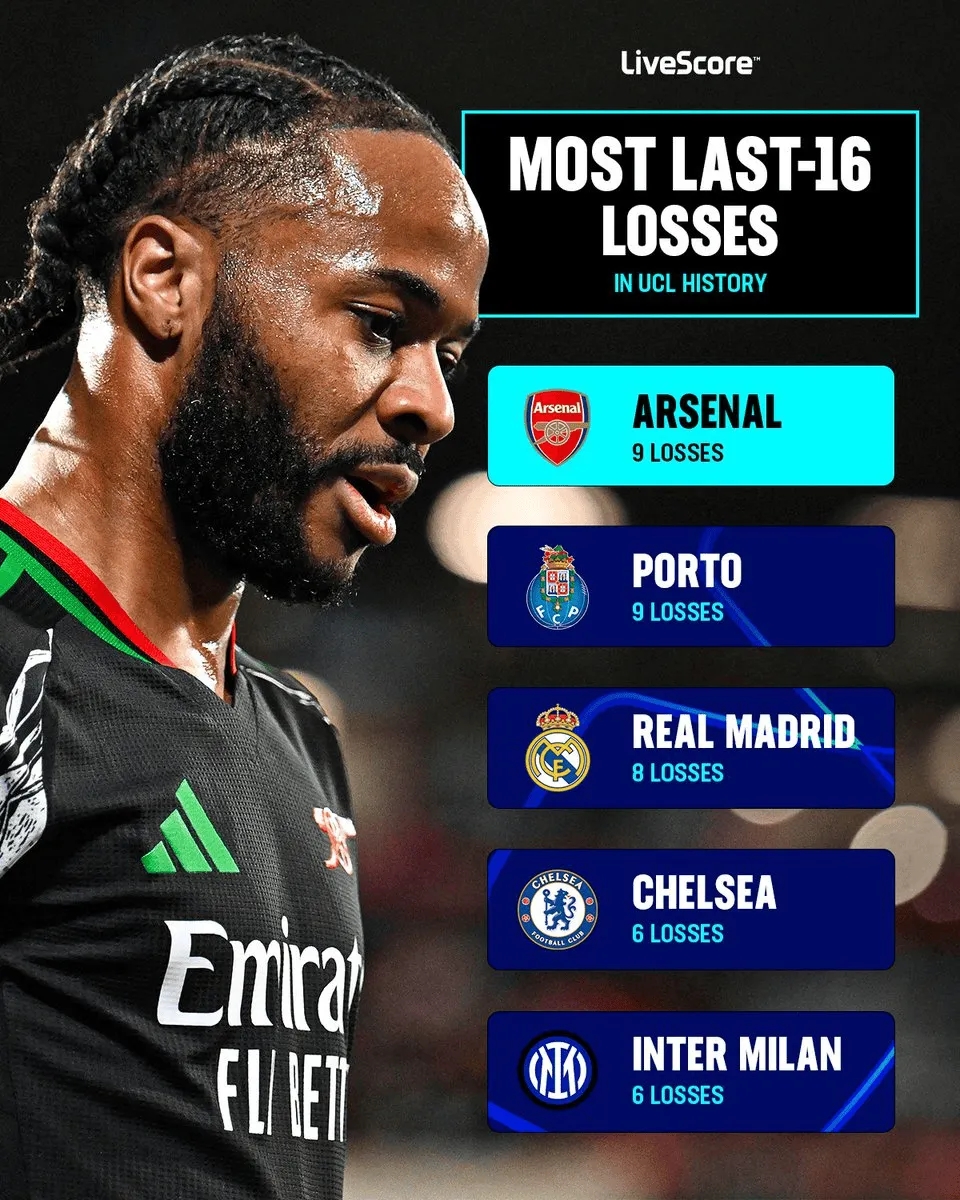 将战埃因霍温!阿森纳在欧冠16强赛中失利9次,和波尔图并列最多