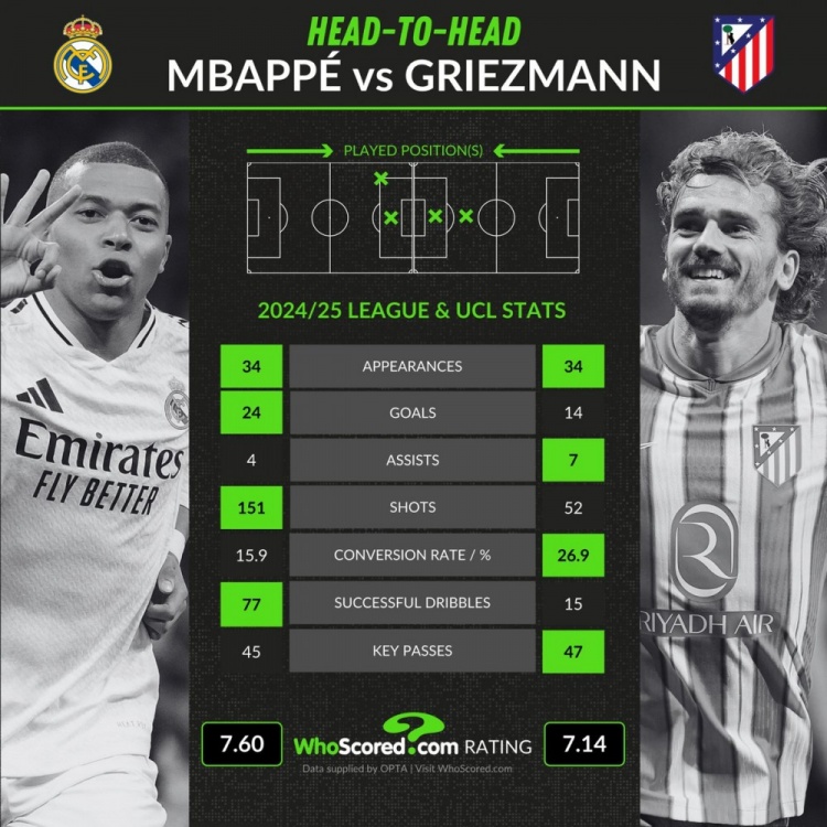 3月5日讯 欧冠十六强战将上演马德里同城德比,whoscored也对比了姆巴佩和格列兹曼本赛季的关键数据。