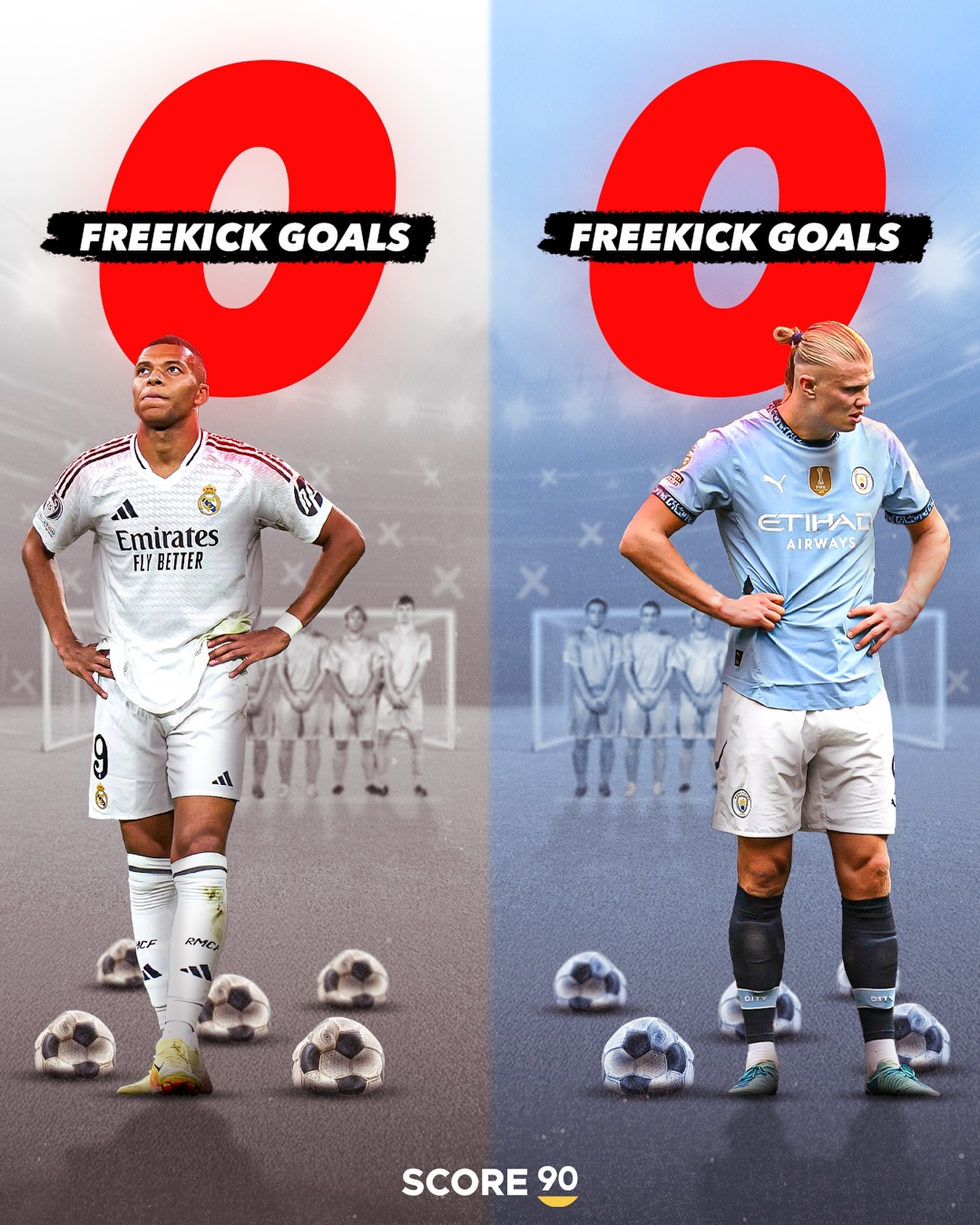 不只是姆巴佩,新双骄的另一位——哈兰德,也从未有过任意球破门。