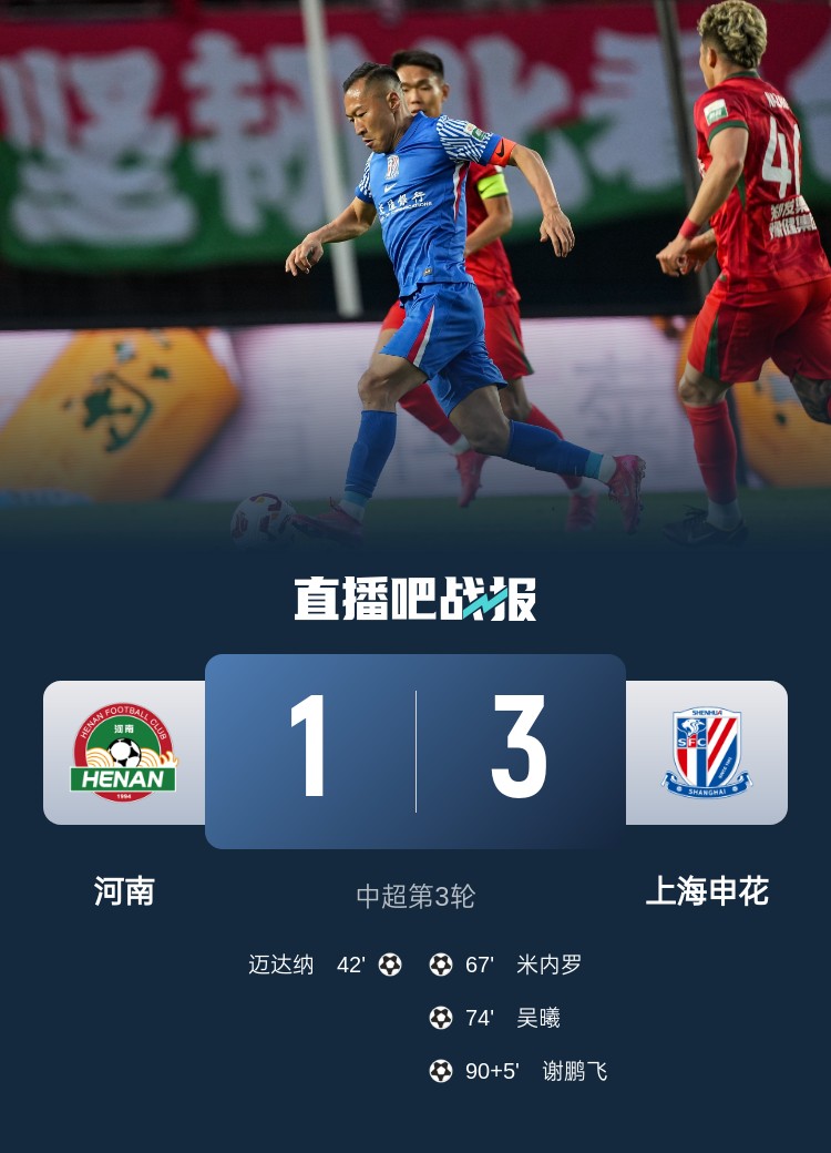 遭逆转后,河南队的韩国籍主帅南基一忍无可忍,直接将刚替换上场15分钟的杨意林换下。申花燃起的求胜欲,彻底摧垮了对手。补时第5分钟,反击中米内罗左肋过人后回传,替补出场的谢鹏飞推入空门,这场大逆转的比分定格在3-1。