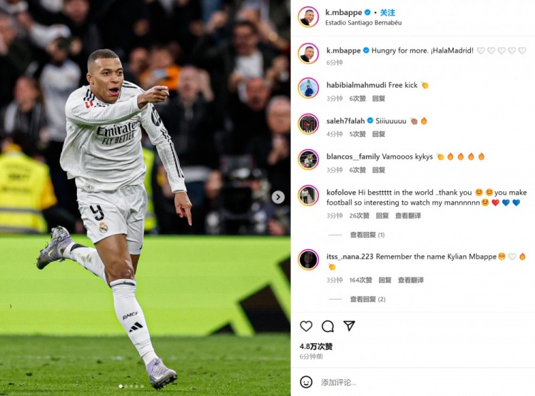 姆巴佩在赛后同社媒晒出自己进球后的庆祝照并配文:“渴望赢得更多!马德里前进!”