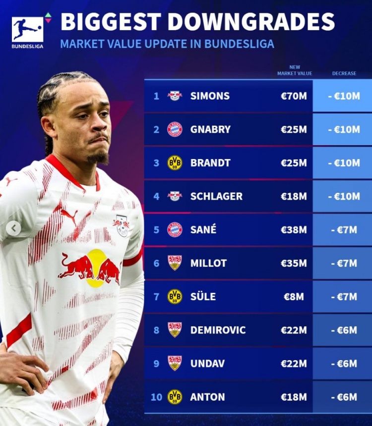 - 德甲身价贬值榜:西蒙斯&格纳布里下跌1000万,萨内&聚勒降700万