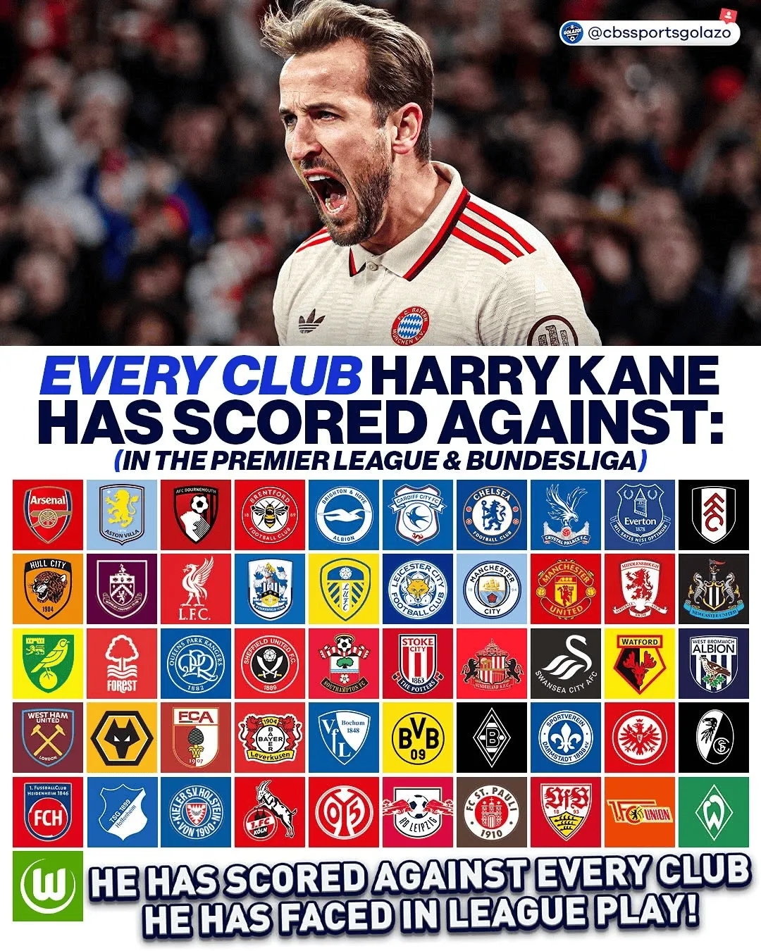 - 通杀,凯恩德甲、英超对阵51家俱乐部均完成破门