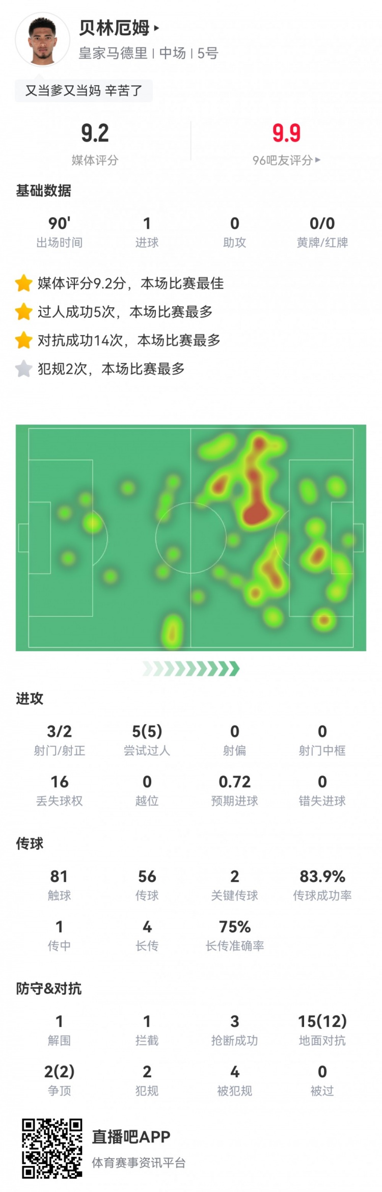 贝林数据:1进球,5次过人全成功,14次成功对抗,全场最高9.2分