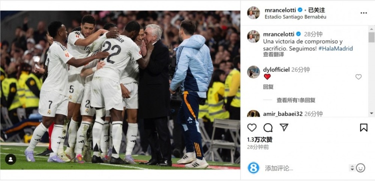 皇马主帅安切洛蒂社媒晒出与球员们庆祝的照片,并配文:“一场奉献和牺牲精神带来的胜利,我们继续前进!”
