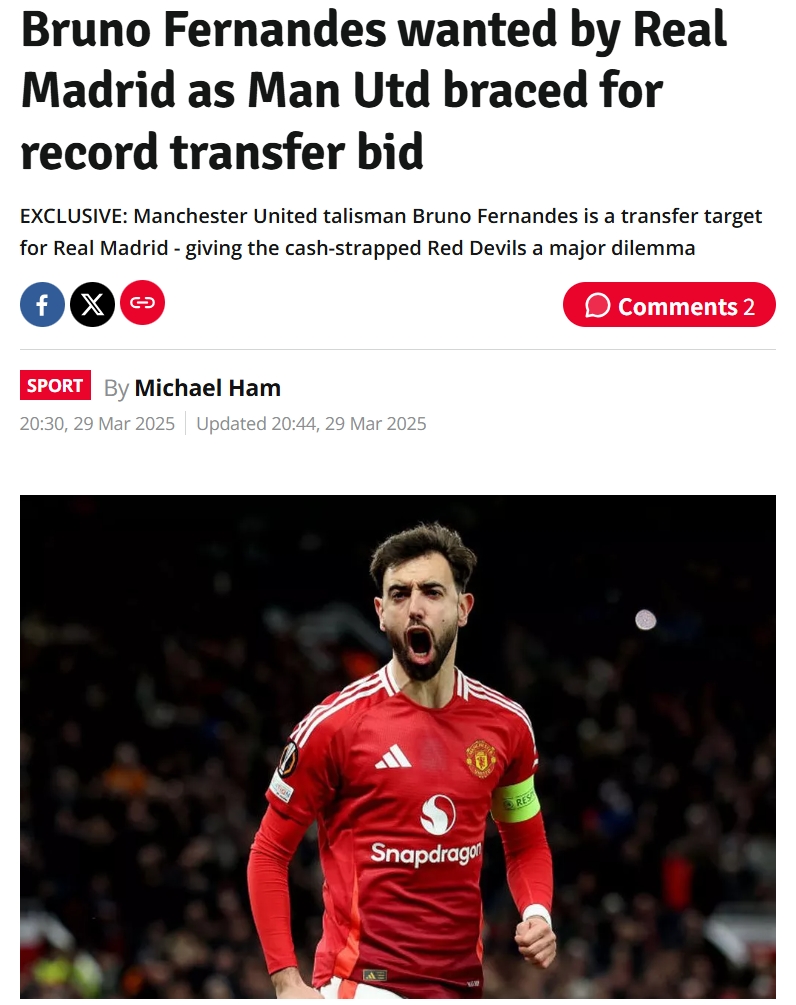 据英国《每日星报》独家消息,皇马可能考虑向曼联支付9000万英镑的转会费,以挖角B费。