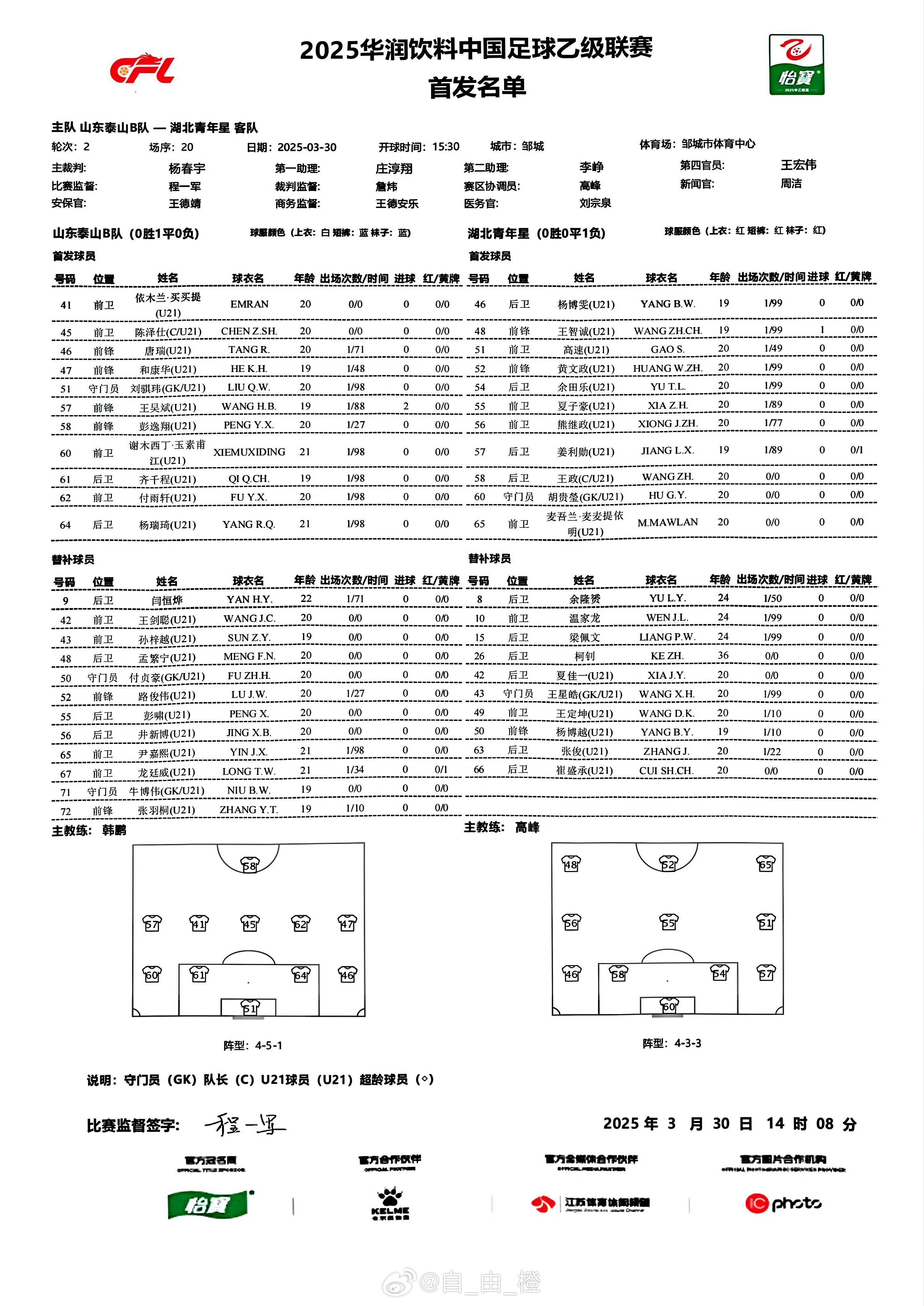 03月30日讯 今日下午进行的中乙第2轮比赛,山东泰山B队vs湖北青年星,依木兰、陈泽仕先发,因年龄造假被禁赛3个月的谢木西丁解禁复出后继续首发。