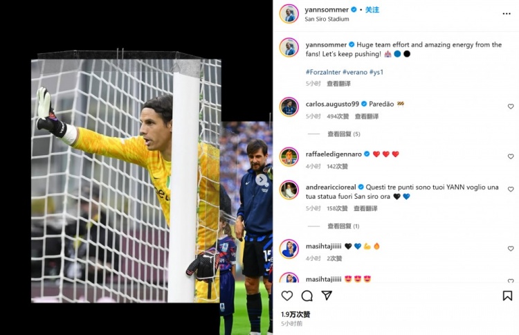 - 神扑救主!索默社媒晒照庆祝:全队做出巨大努力,让我们继续前进