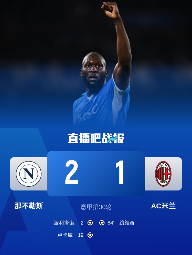 意甲第30轮,那不勒斯2-1AC米兰,波利塔诺开场闪击,卢卡库破门。