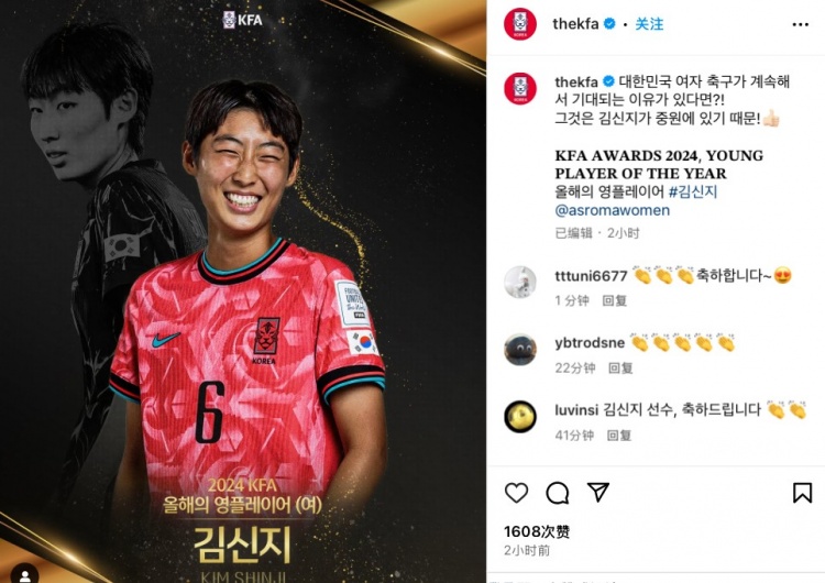 3月31日讯 韩国足协今日发布公告,公布了该足协2024年度各项最佳奖项得主,其中年度最佳年轻球员得主为18岁小将梁民革。