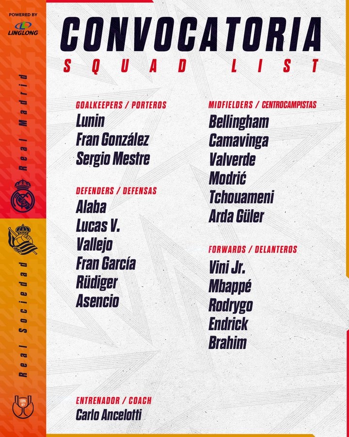 3月31日讯 北京时间4月2日周三凌晨3点30分,皇家马德里将在国王杯半决赛次回合主场对阵皇家社会,首回合皇马1-0取胜,今天皇马公布了次回合比赛日名单,具体如下: