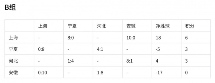 上海队以6分、18个净胜球的优势提前出线。宁夏和河北同积3分,宁夏净胜球为 -5,河北净胜球为4,安徽积0分已出局。最后一轮比赛,各队的表现将决定最终排名,宁夏和河北都渴望在最后一战中争取更好名次。