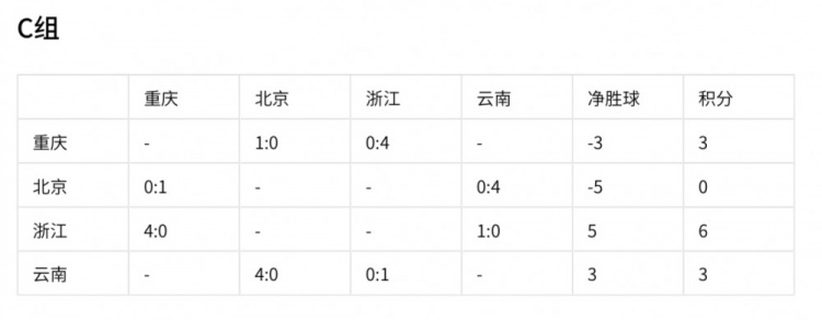 浙江队已凭借6分和5个净胜球提前出线。重庆和云南同积3分,重庆净胜球为 -3,云南净胜球为3,北京积0分已无缘出线。最后一轮重庆与云南的直接对话成为焦点,根据规则,谁获胜谁将获得小组第二出线;若双方打平,双方各积4分,云南将因净胜球优势获得小组第二,重庆则积4分获小组第三。浙江与北京的比赛胜负对大局无影响。