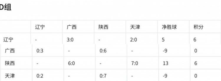 辽宁、陕西同积6分,净胜球分别为5和13,两队已提前出线。广西和天津均积0分已确定出局。最后一轮辽宁与陕西的较量,将决定小组头名归属,双方势必全力以赴。天津与广西的比赛也将是她们为荣誉而战的机会。