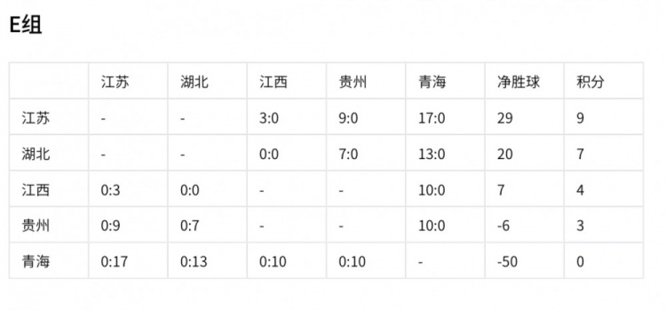 江苏队以9分和29个净胜球的绝对优势提前出线。湖北积7分、净胜球20个,出线形势大好;江西积4分、净胜球7个,仍有出线机会;贵州积3分、净胜球 -6,青海积0分、净胜球 -50已出局。最后一轮比赛,各队之间的竞争将决定剩余出线名额的归属,比赛结果充满悬念。