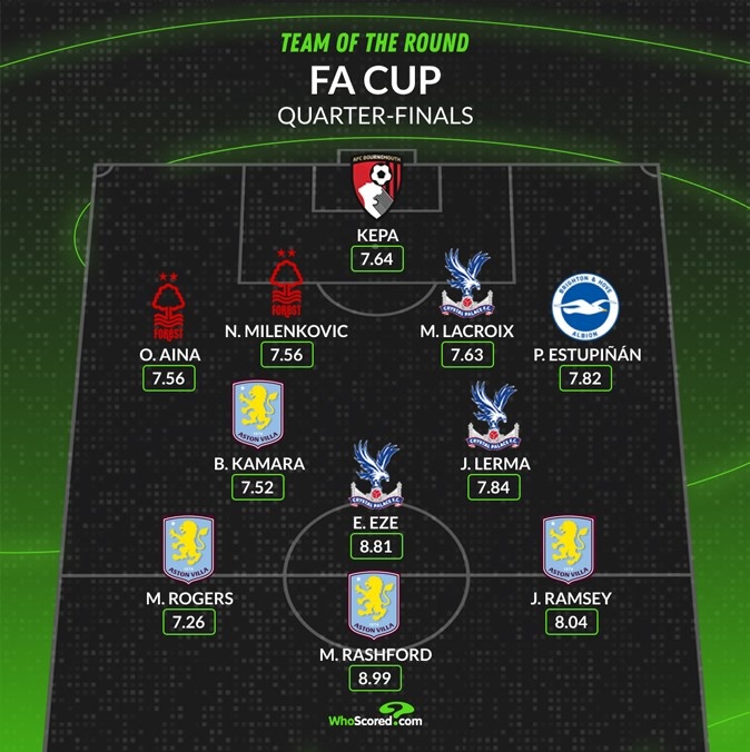 3月31日讯 足总杯八强战已经完赛,whoscored也列出了本轮评分最佳阵容,维拉4将在列。