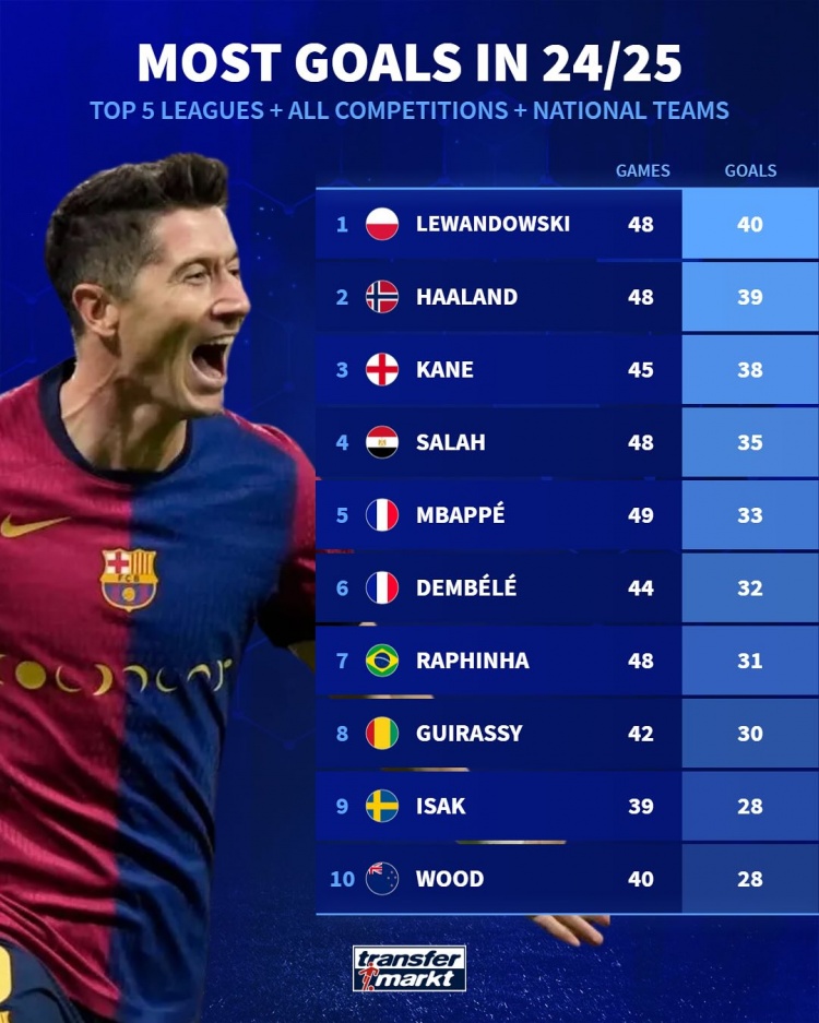3月31日讯 德国转会市场统计了本赛季五大联赛球员所有赛事的进球数量,并列出榜单,36岁莱万以40球居首,哈兰德、凯恩排名二三位。